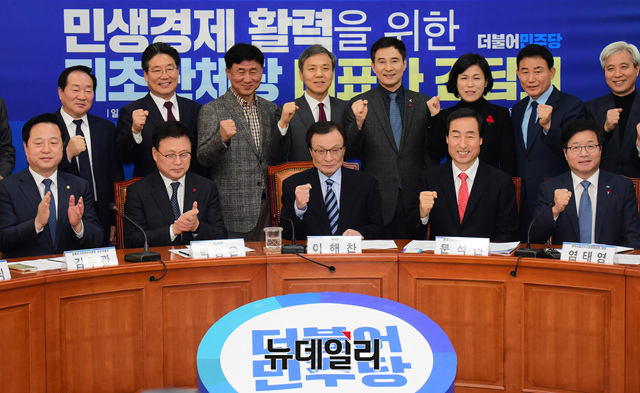 이해찬 더불어민주당 대표가 11일 오후 국회에서 열린 민생경제 활력을 위한 기초단체장 대표자 간담회에서 참석자들과 기념촬영을 하고 있다.