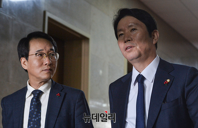 이인영 더불어민주당 원내대표와 이원욱 원내수석부대표가 12일 오후 국회에서 3당 원내대표들과 패스트트랙에 오른 선거제 개혁안과 검찰개혁법안 처리 방안, 본회의 개의 시점 등을 논의하기 위해 국회의장실로 입장하고 있다.