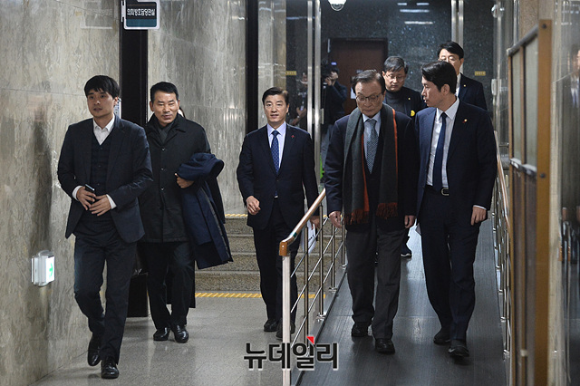 이해찬 더불어민주당 대표와 이인영 원내대표 및 지도부가 13일 오전 국회에서 열린 의원총회에 입장하고 있다. 이날 의총은 비공개로 진행됐다.