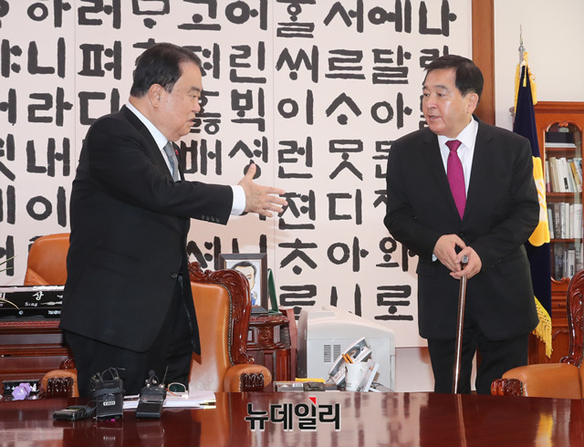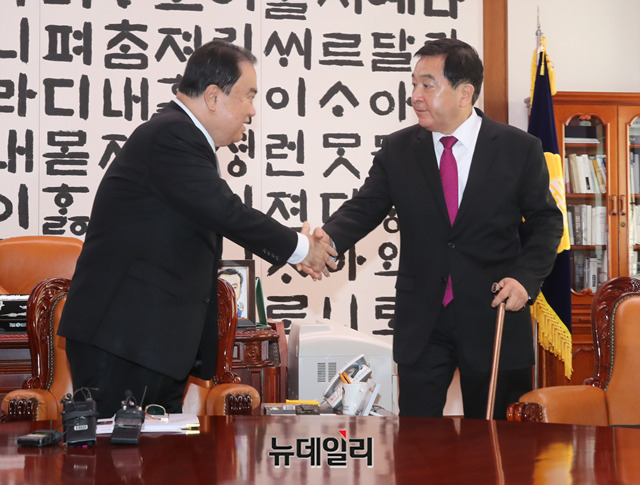 문희상 국회의장과 심재철 자유한국당 원내대표가 13일 오전 국회에서 열린 국회의장 주재 3당 원내대표 회동에서 인사를 하고 있다.