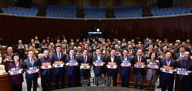 황교안 자유한국당 대표, 심재철 원내대표 및 한국당 의원들이 13일 오후 국회에서 '의원직 세습 NO', '아빠 찬스 OUT'라고 적힌 손 피켓을 들고 구호를 외치고 있다.