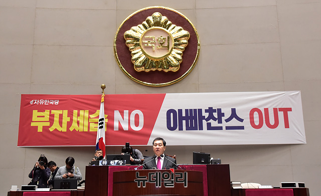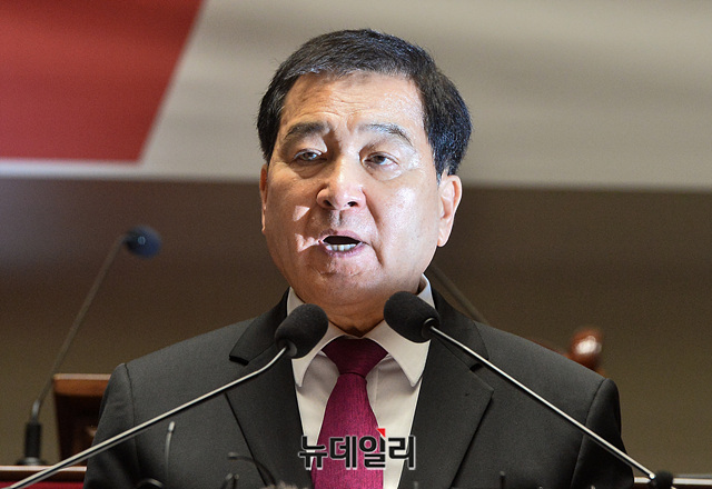 심재철 자유한국당 원내대표가 13일 오후 국회에서 열린 의원총회에서 모두발언을 하고 있다.