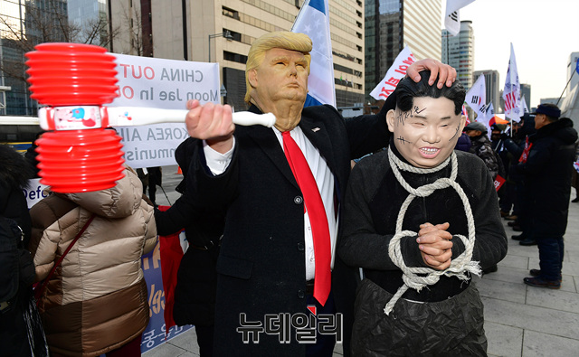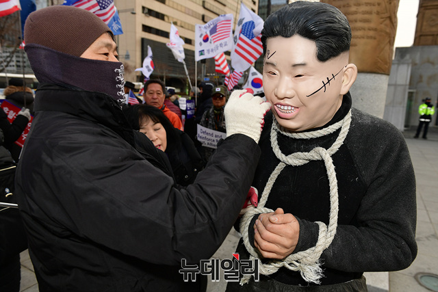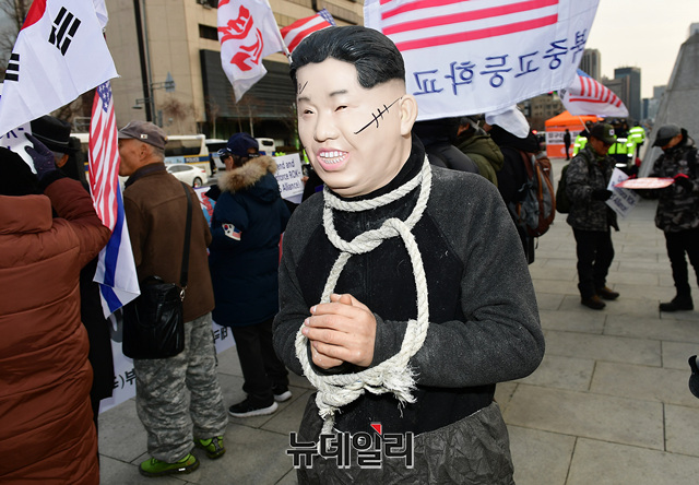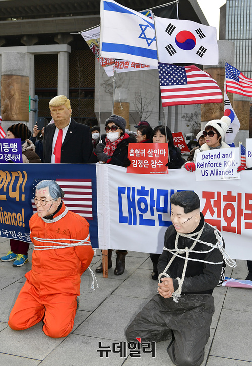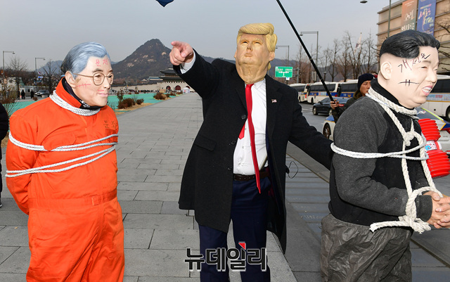 태극기혁명국민운동본부가 13일 오후 광화문 광장에서 '성조기 훼손'과 '주한미국대사 비하'를 규탄하며 북한 김정은을 체포하는 퍼포먼스를 하고 있다. 퍼포먼스에는 문재인 대통령, 트럼프 미국 대통령, 북한 김정은이 등장했다.