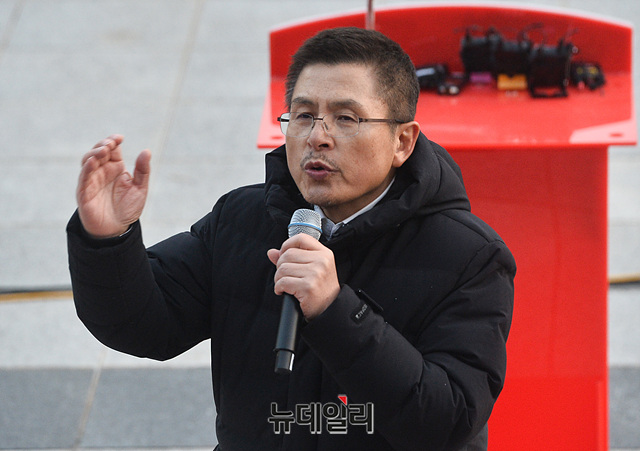 황교안 자유한국당 대표가 13일 오후 국회 본청 앞 계단에서 열린 '패스트트랙 법안 날치기 상정 저지 규탄대회'에서 모두발언을 하고 있다.