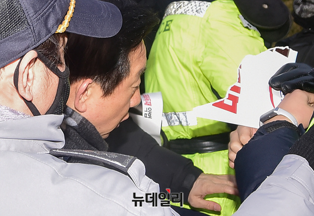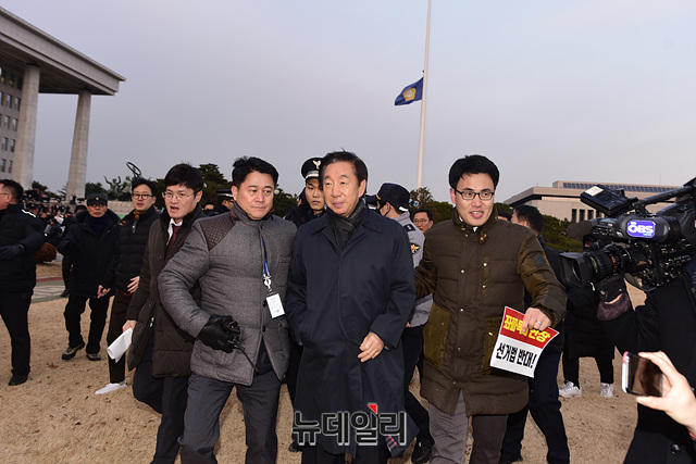 김성태 자유한국당 의원이 13일 오후 국회 본관 앞 계단에서 열린 '패스트트랙 법안 날치기 상정 저지 규탄대회'에서 일부 시민들에게 거친 항의를 받고 있다.