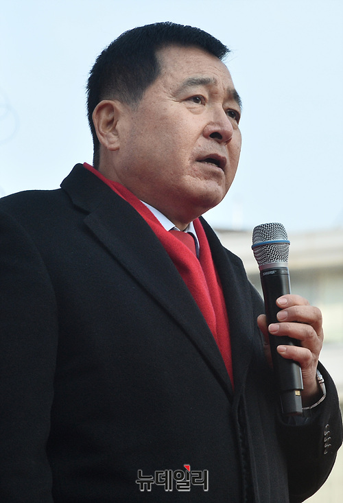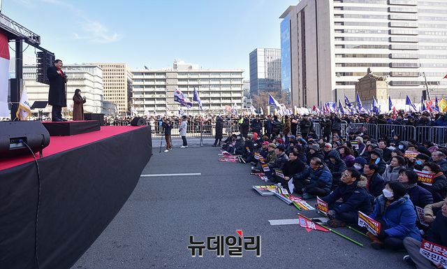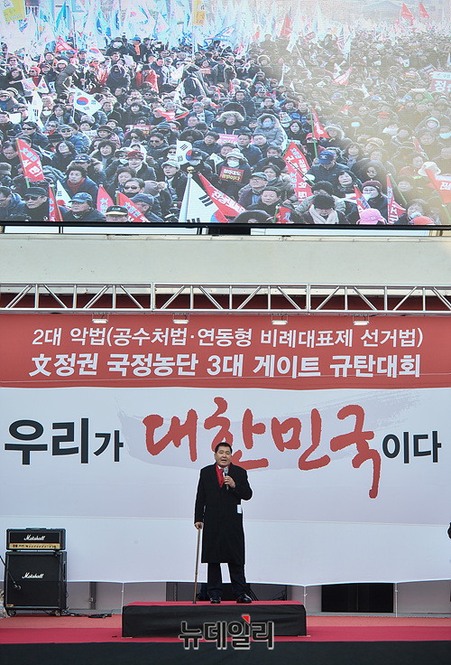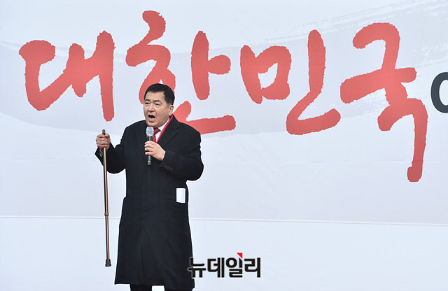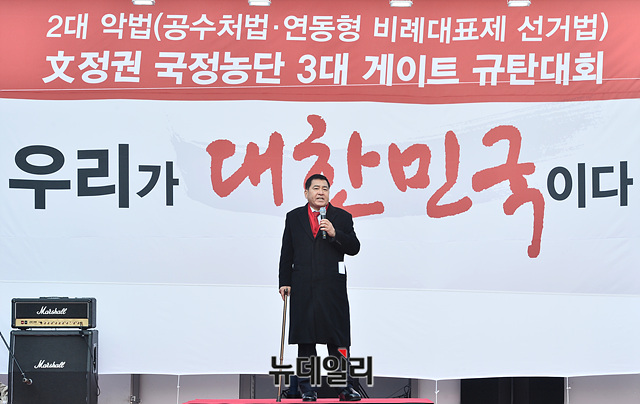 심재철 자유한국당 원내대표가 14일 오후 서울 종로구 세종문화회관 앞에서 열린 '文정권 국정농단 3대 게이트 규탄대회'에서 발언을 하고 있다. 이날 심 원내대표는 "친문재인 3대 게이트 문이 열리면 문 정권은 끝날 것"이라며 "대한민국 민주제도 자체를 말살시키려는 못된 세력을 반드시 응징하고 바로 잡아야 한다"고 말했다.