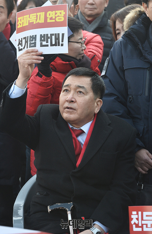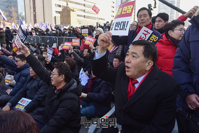 심재철 자유한국당 원내대표가 14일 오후 서울 종로구 세종문화회관 앞에서 열린 '文 정권 국정농단 3대 게이트 규탄대회'에서 손 피켓을 들고 구호를 외치고 있다.