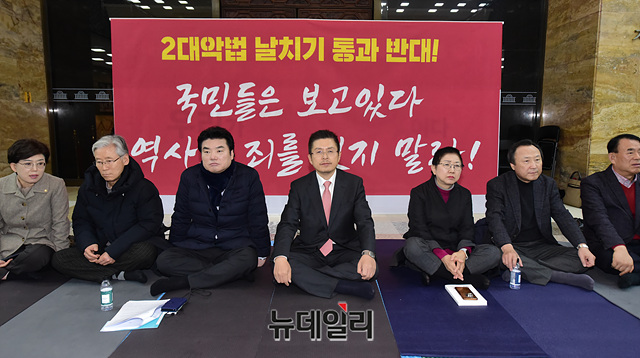 황교안 자유한국당 대표와 한국당 의원들이 15일 오후 국회 로텐더홀에서 패스트트랙 법안 저지 릴레이 연좌 농성을 하고 있다.