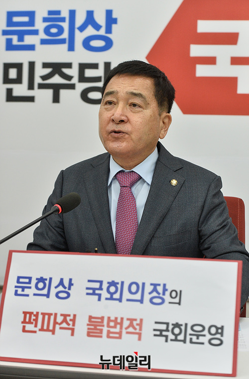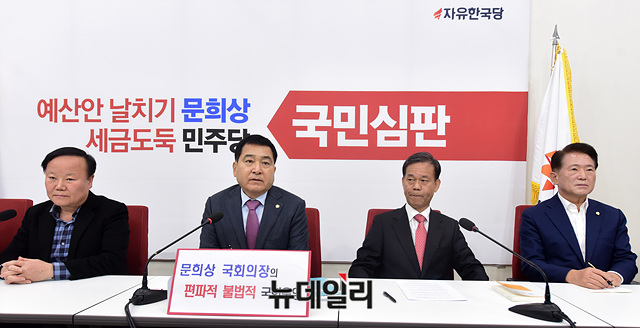 심재철 자유한국당 원내대표가 15일 오후 국회 원내대표실에서 기자간담회를 열고, 문희상 국회의장의 편파적, 불법적 국회운영에 대해 비판 하고 있다.