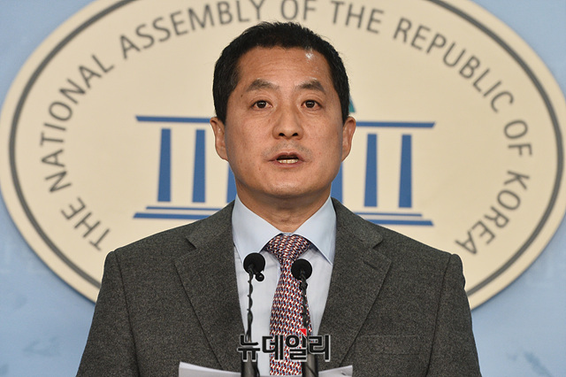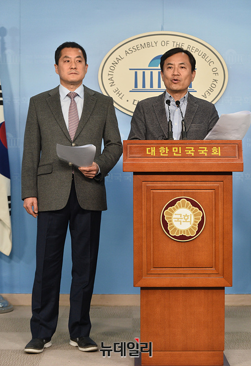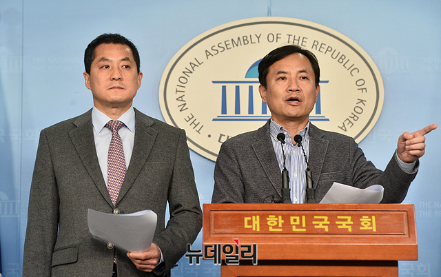박대출 자유한국당 의원과 김진태 의원이 15일 오후 국회 정론관에서 기자회견을 열고, 문희상 국회의장에게 무제한 토론(필리버스터)을 보장할 것을 촉구했다.