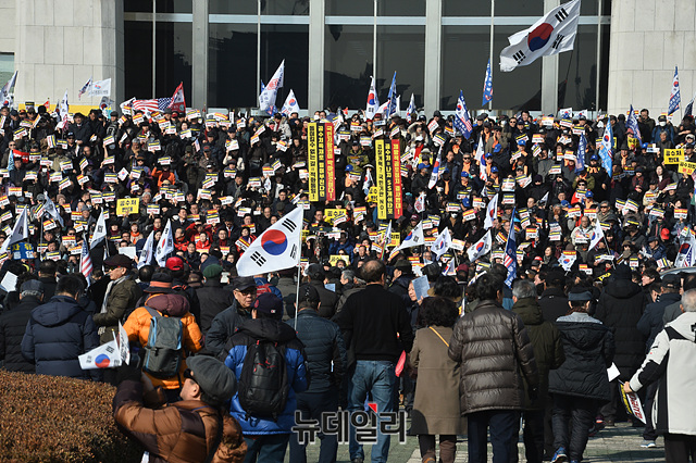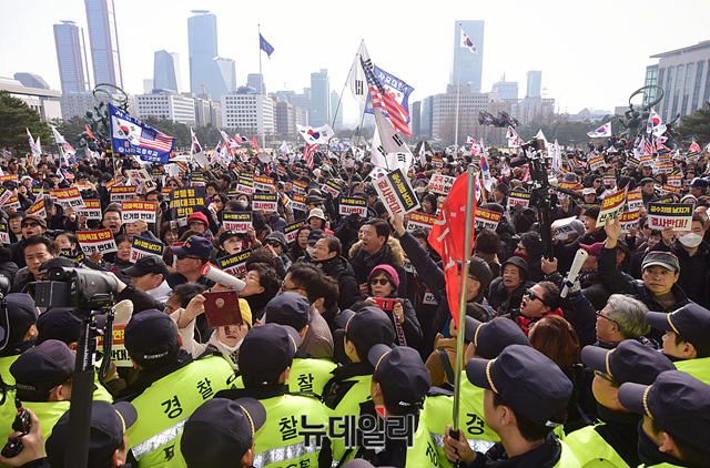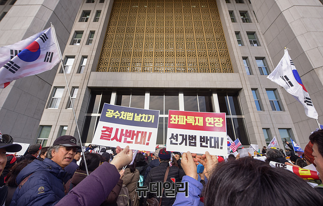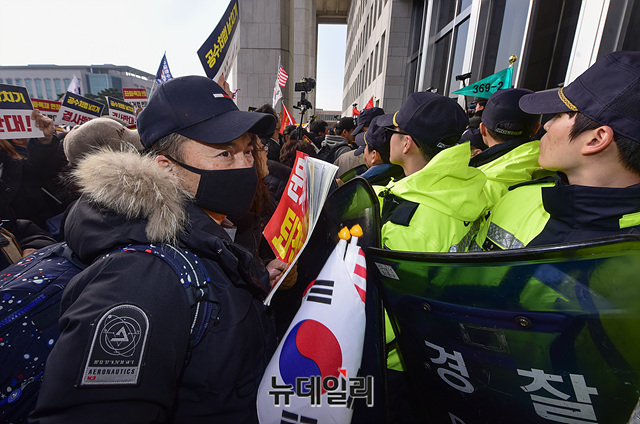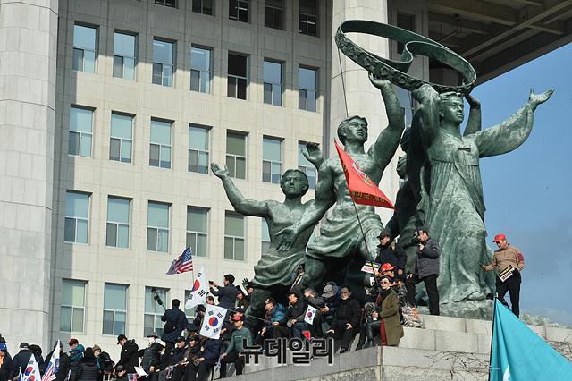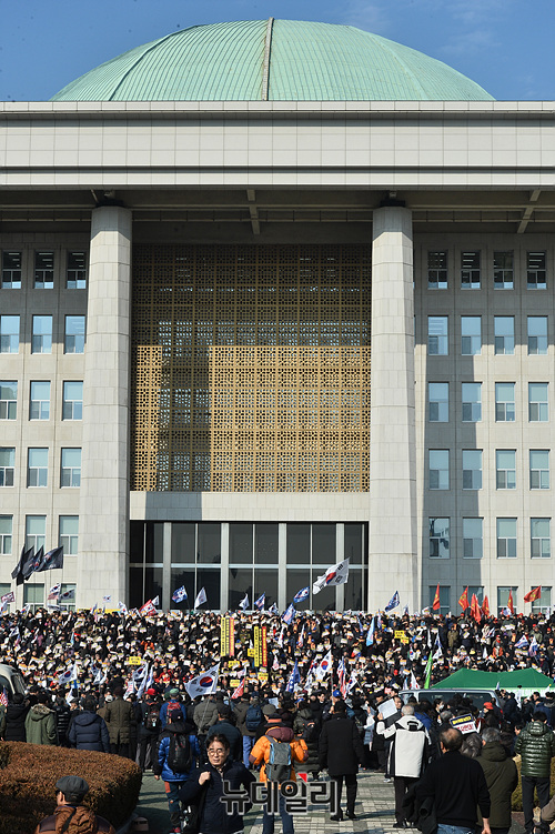 패스트트랙(신속처리안건) 지정 법안의 국회 통과를 반대하는 우파 시민들이 16일 오전 국회 본관 앞에서 농성을 벌이고 있다. 이들은 선거법, 공수처법 반대를 외치며 국회 본청 진입을 시도하다 한때 경찰과 몸싸움을 벌이기도 했다.