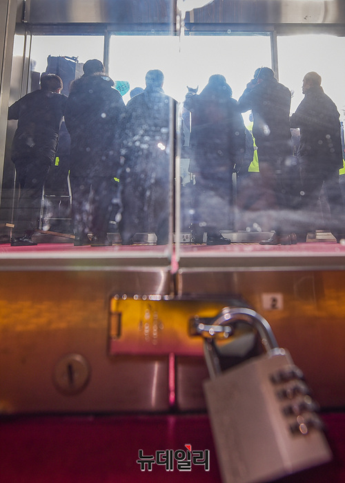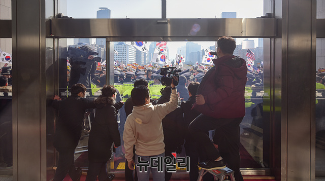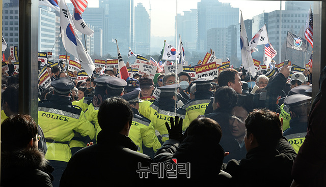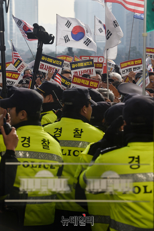 패스트트랙(신속처리안건) 지정 법안의 국회 통과를 반대하는 우파 시민들이 16일 오후 국회 본청 진입을 시도하는 가운데 경찰이 국회 진입 시도를 저지하고 있다.