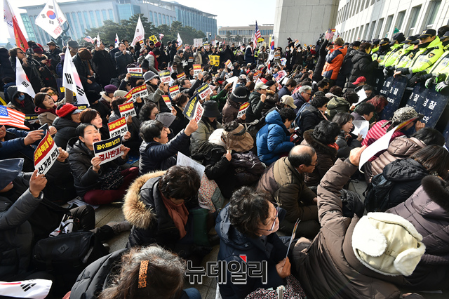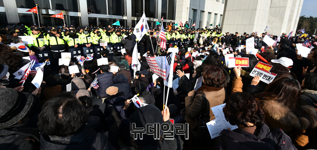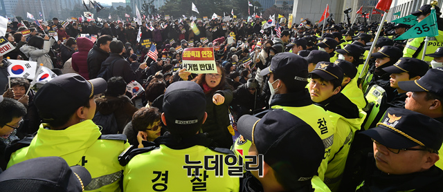 패스트트랙(신속처리안건) 지정 법안의 국회 통과를 반대하는 우파 시민들이 16일 오전 국회 본관앞에서 농성을 벌이고 있다. 이들은 선거법, 공수처법 반대를 외치며 국회 본청 진입을 시도하다 한때 경찰과 몸싸움을 벌이기도 했다.