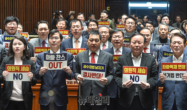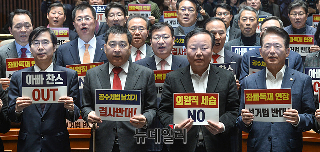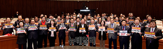 심재철 자유한국당 원내대표, 김재원 정책위의장 및 한국당 의원들이 16일 오후 국회에서 열린 의원총회에서 손 피켓을 들고 구호를 외치고 있다.