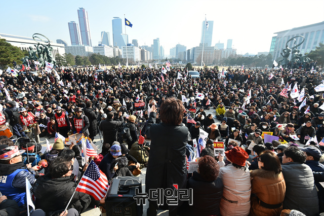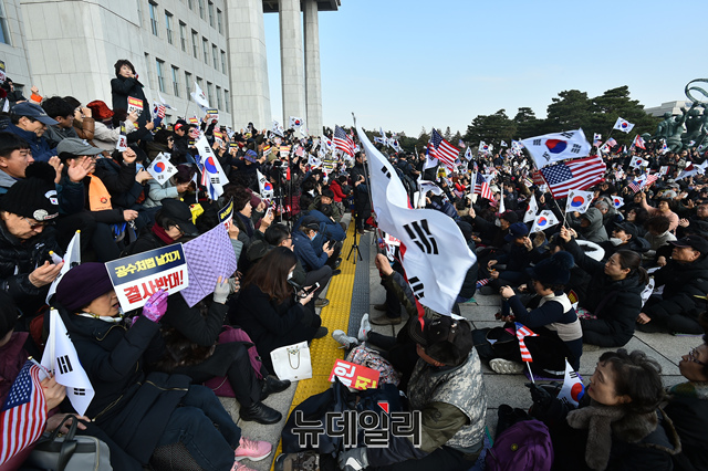 패스트트랙(신속처리안건) 지정 법안의 국회 통과를 반대하는 우파 시민들이 16일 오전 국회 본관앞에서 농성을 벌이고 있다. 이들은 선거법, 공수처법 반대를 외치며 국회 본청 진입을 시도하다 한때 경찰과 몸싸움을 벌이기도 했다.