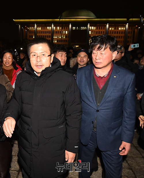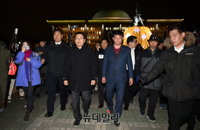 황교안 자유한국당 대표가 16일 오후 국회 본관앞에서 패스트트랙(신속처리안건) 지정 법안의 국회 통과를 반대하며 농성 중인 우파 시민들의 해산을 설득해 국회 정문으로 이끌고 있다. 대부분 시민들은 자진 철수 했으나 약 40여 명이 해산을 거부하고 경찰과 대치를 벌였다.
