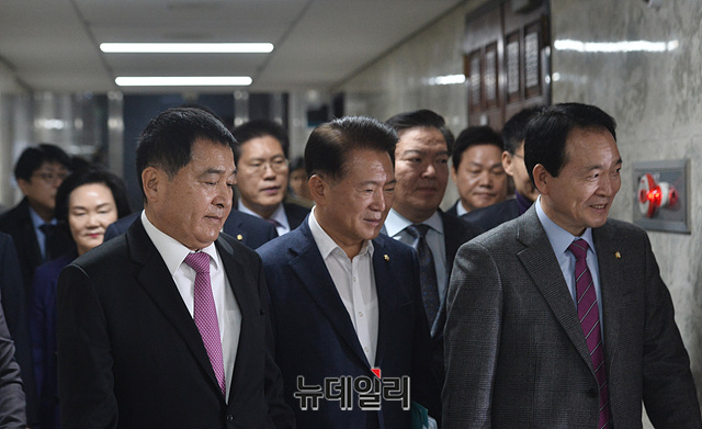 심재철 자유한국당 원내대표 및 지도부가 17일 오전 국회에서 열린 원내대책회의에 입장하고 있다.