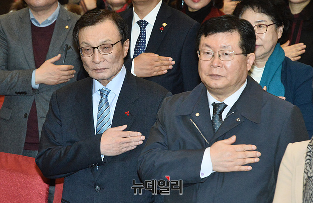 이해찬 더불어민주당 대표와 설훈 의원이 17일 오전 국회 의원회관에서 열린 민주당 당원교과서 출판기념회에서 국민의례를 하고 있다.