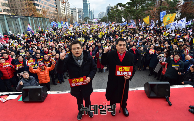 황교안 자유한국당 대표와 심재철 원내대표가 17일 오후 국회 밖에서 열린 공수처법 선거법 날치기 저지 규탄대회에서 참석자들과 선거법과 공수처 반대 구호를 외치고 있다.