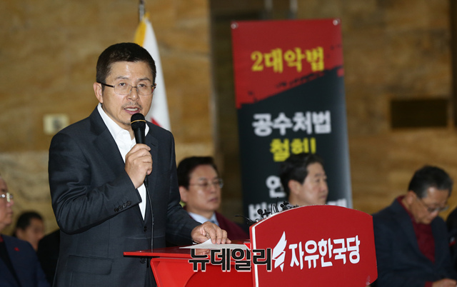 황교안 자유한국당 대표가 18일 오전 국회에서 열린 당대표 주재 최고위원‧중진의원 연석회의에서 모두발언을 하고 있다.