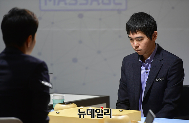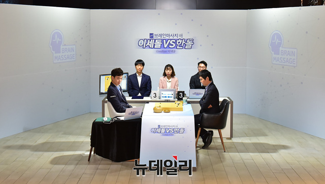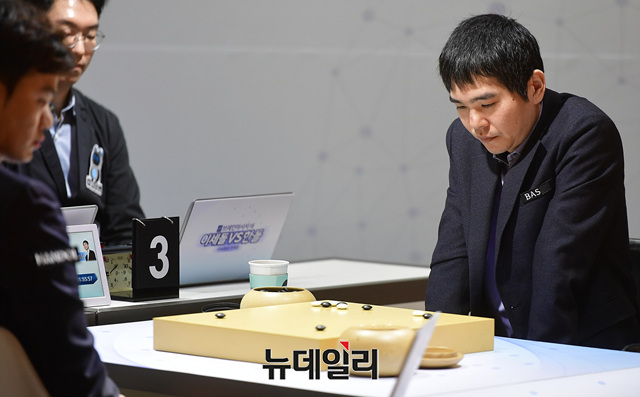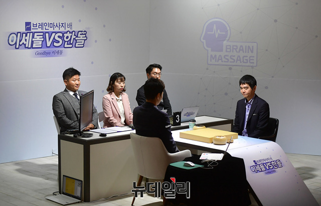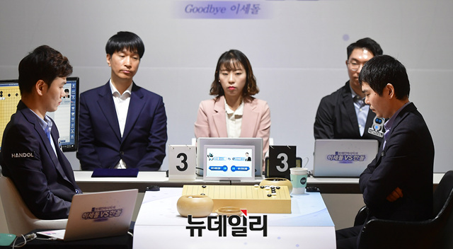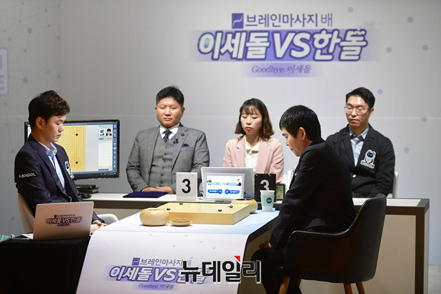 최근 은퇴를 선언한 이세돌 9단이 18일 정오 서울 강남구 바디프랜드 본사에서 AI(인공지능) 바둑 프로그램 '한돌'과 대국에 앞서 눈을 감고 생각을 대국을 준비하고 있다.이 9단은 이날 정오에 진행된 대국 1국에 이어 19일 같은 장소에서 대국 2국이 진행된다. 마지막 대국인 3국은 21일 이 9단의 고향인 전남 신안군에서 진행된다.대국 방식은 3번기(치수고치기)로 진행된다. 치수고치기는 두 대국자 사이의 기력 차이를 조정하기 위해 두는 바둑으로 대국 결과에 따라 정해진 규칙에 따라 치수를 조정한다. 이 9단은 흑을 잡고 두 점을 깔고 시작한다. 백돌을 잡은 한돌은 덤 7집 반을 받는다.대국은 K바둑과 SBS에서 동시 중계 된다.