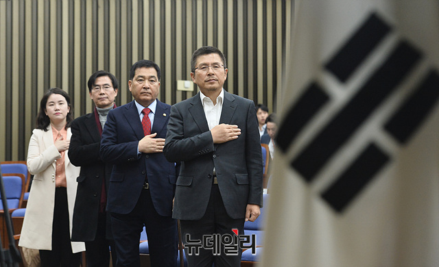 황교안 자유한국당 대표와 심재철 원내대표 및 최고위원들이 18일 오후 국회에서 열린 의원총회에서 국민의례를 하고 있다.