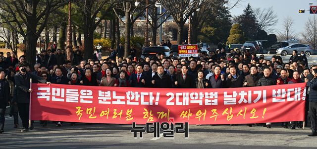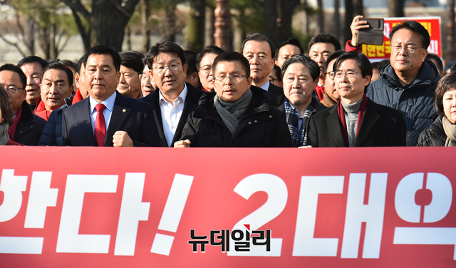 황교안 자유한국당 대표와 심재철 원내대표를 및 소속 의원들이 18일 오후 공수처법 선거법 날치기 저지 규탄대회를 갖기위해 국회 밖으로 향하고 있다.