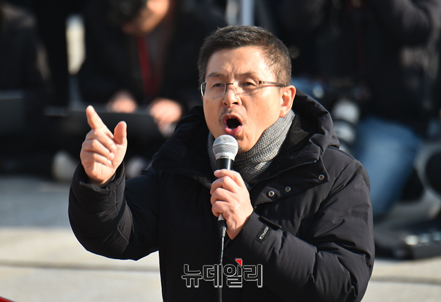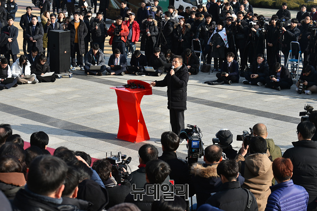 황교안 자유한국당 대표가 18일 오전 국회에서 열린 공수처법·선거법 날치기 저지 규탄대회에서 모두발언을 하고 있다.