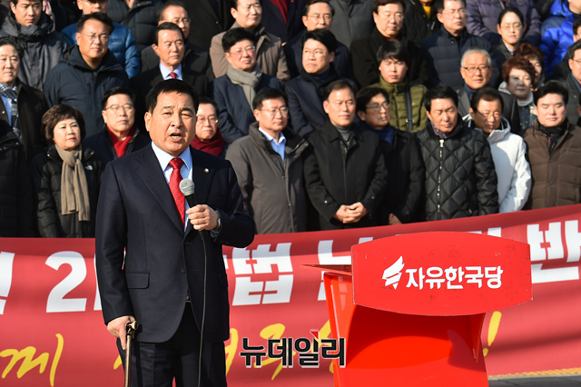 심재철 자유한국당 원내대표가 18일 오전 국회에서 열린 공수처법·선거법 날치기 저지 규탄대회에서 모두발언을 하고 있다.