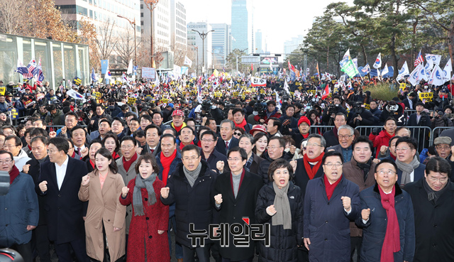 황교안 자유한국당 대표, 심재철 원내대표 및 소속의원들이 17일 오후 국회 밖에서 열린 공수처법 선거법 날치기 저지 규탄대회에서 참석자들과 선거법과 공수처 반대 구호를 외치고 있다.