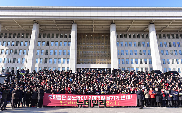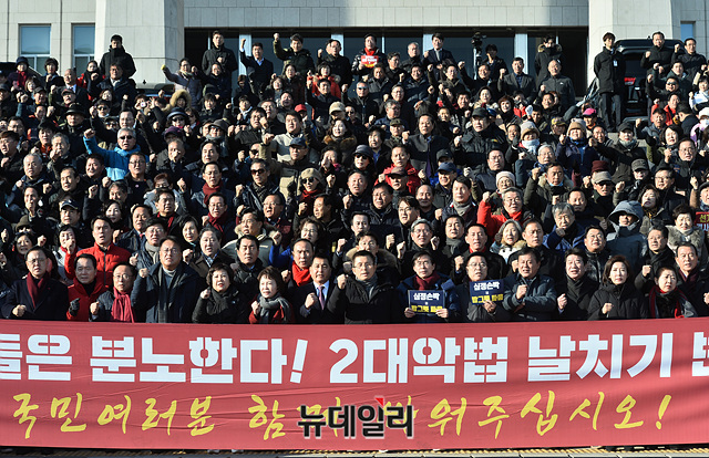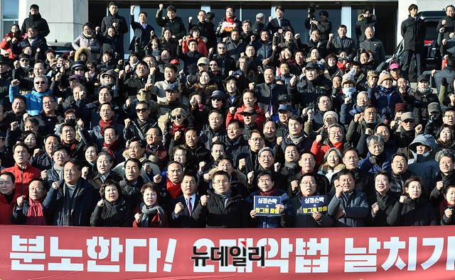 [포토] 국회 앞서 '공수처법 선거법 날치기' 규탄 구호외치는 한국당