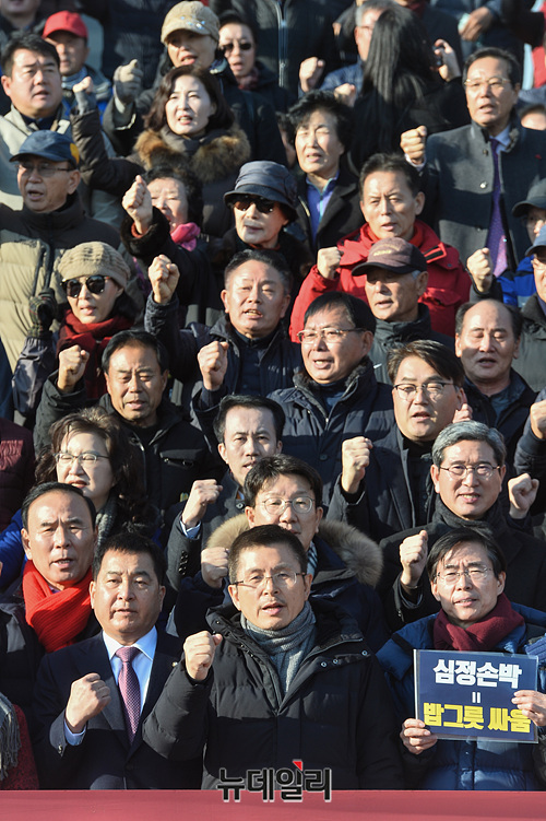 황교안 자유한국당 대표, 심재철 원내대표, 한국당 의원 및 시민들이 19일 오후 국회 본청 앞 계단에서 열린 '공수처법 선거법 날치기 저지 규탄대회'에서 구호를 외치고 있다.