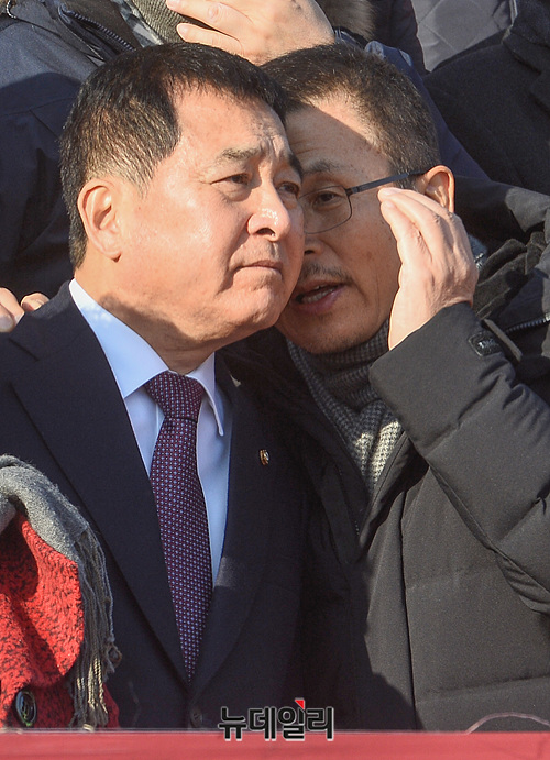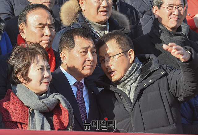 황교안 자유한국당 대표와 심재철 원내대표가 19일 오후 국회 본청 앞 계단에서 열린 '공수처법 선거법 날치기 저지 규탄대회'에서 귀엣말을 하고 있다.
