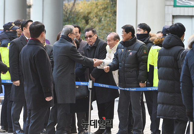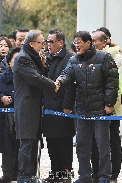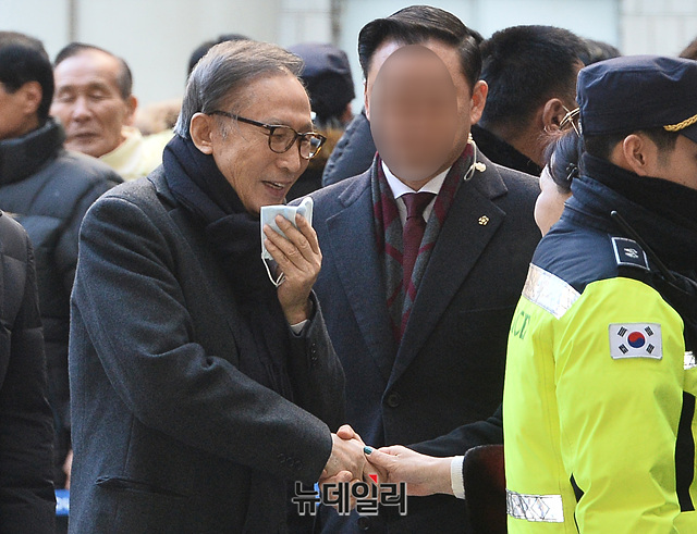 이명박 전 대통령이 20일 오전 서울 서초구 서울고등법원에서 열린 항소심 속행 공판에 출석하며 기다리던 지지자들을 향해 인사하고 있다.