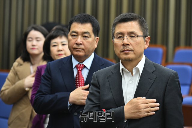황교안 자유한국당 대표와 심재철 원내대표가 20일 오후 국회에서 열린 의원총회에서 국민의례를 하고 있다.