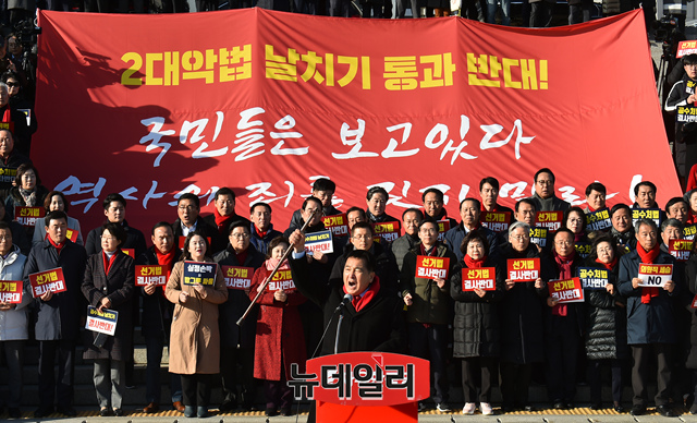 심재철 자유한국당 원내대표가 20일 오전 국회에서 열린 공수처법·선거법 날치기 저지 규탄대회에서 발언을 하고 있다.