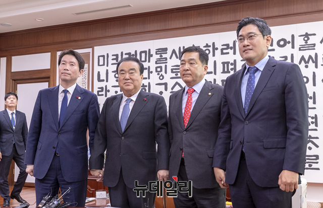 문희상 국회의장이 23일 오전 국회의장실에서 교섭단체 3당 원내대표와 회동을 하고 있다. (왼쪽부터 이인영 더불어민주당 원내대표, 문 의장, 심재철 자유한국당 원내대표, 오신환 바른미래당 원내대표.)
