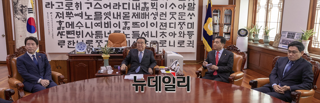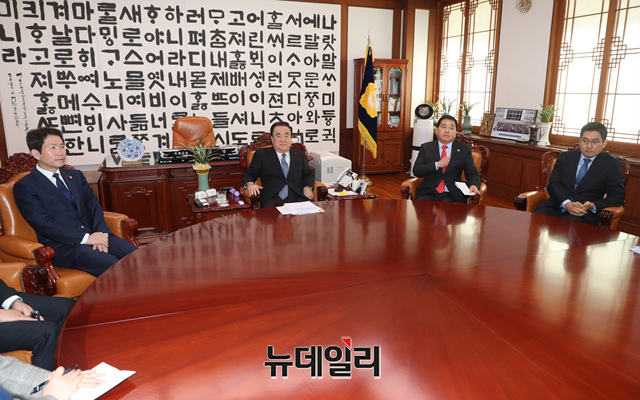 문희상 국회의장이 23일 오전 국회의장실에서 교섭단체 3당 원내대표와 회동을 하고 있다. (왼쪽부터 이인영 더불어민주당 원내대표, 문 의장, 심재철 자유한국당 원내대표, 오신환 바른미래당 원내대표.)