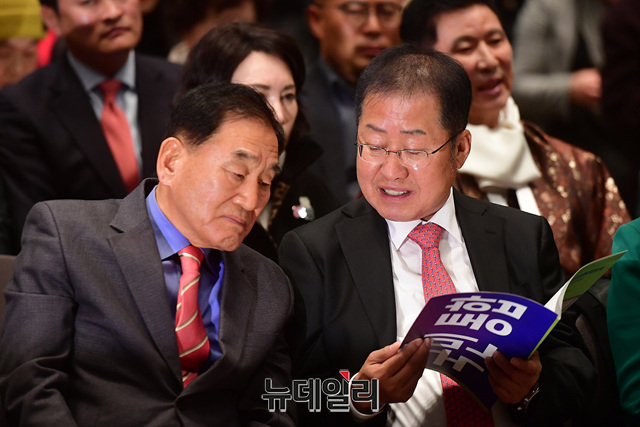 홍준표 전 자유한국당 대표와 이재오 상임고문이 23일 오전 서울 중구 한국프레스센터에서 열린 국민통합연대 창립대회에 참석해 대화를 나누고 있다.
