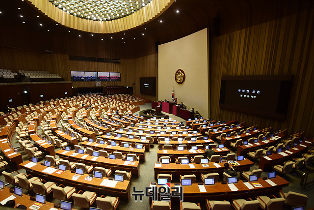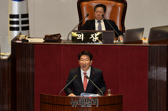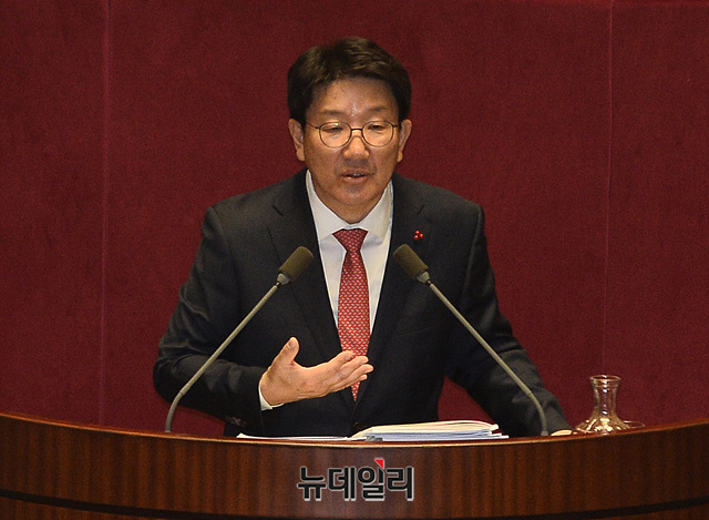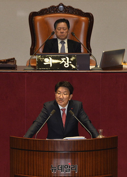 권성동 자유한국당 의원이 24일 오전 국회 본회의장에서 열린 제372회 제1차 본회의에서 선거법 개정에 대한 반대입장을 밝히는 무제한 토론(필리버스터)을 하고 있다.