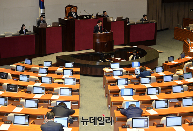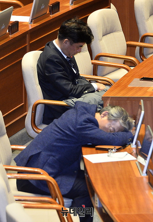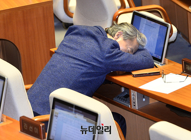 전재수 더불어민주당 의원이 24일 오전 국회 본회의장에서 열린 제372회 제1차 본회의에서 권성동 자유한국당 의원의 무제한 토론(필리버스터)때 잠을 청하고 있다.