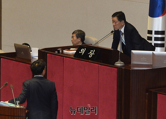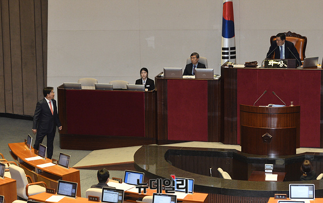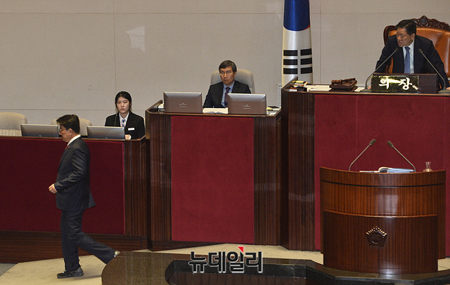 권성동 자유한국당 의원이 24일 오전 국회 본회의장에서 열린 제372회 제1차 본회의에서 선거법 개정에 대한 반대입장을 밝히는 무제한 토론(필리버스터) 도중 주승용 국회 부의장에게 화장실을 보내달라고 요구한 뒤 본회의장을 나서고 있다.