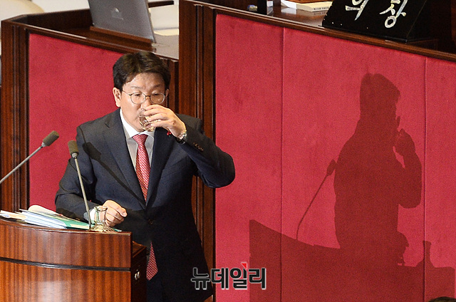 권성동 자유한국당 의원이 24일 오전 국회 본회의장에서 열린 제372회 제1차 본회의에서 선거법 개정에 대한 반대입장을 밝히는 무제한 토론(필리버스터)에서 물을 마시고 있다.