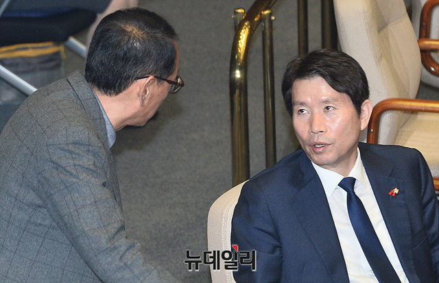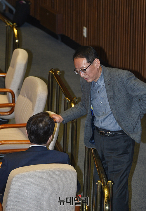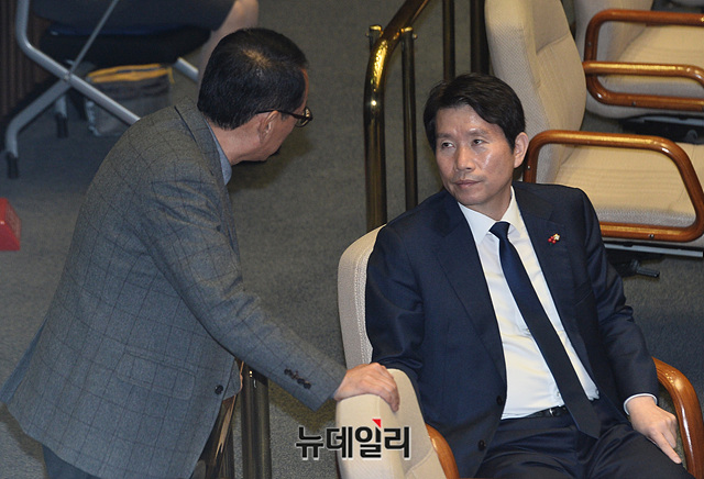 이인영 더불어민주당 원내대표와 김도읍 자유한국당 의원이 24일 오전 국회 본회의장에서 열린 제372회 제1차 본회의에서 대화를 나누고 있다.