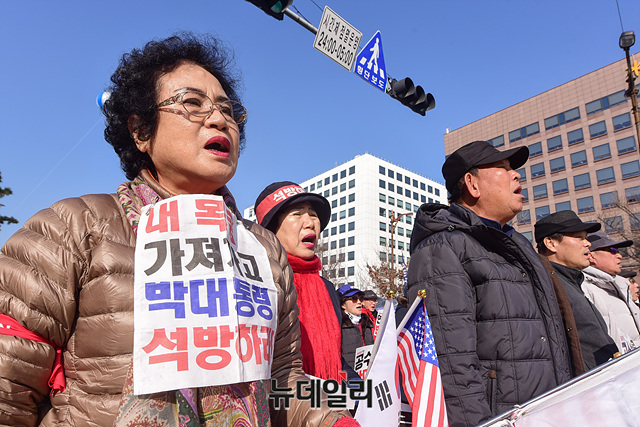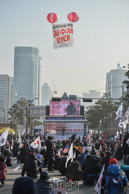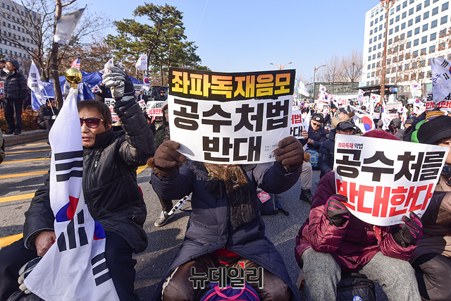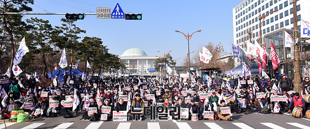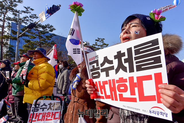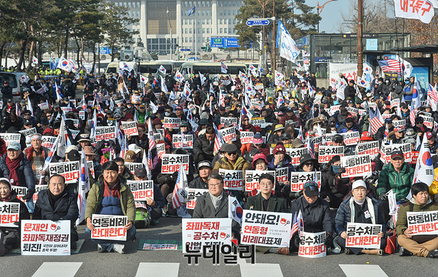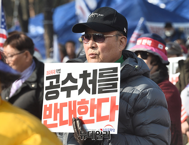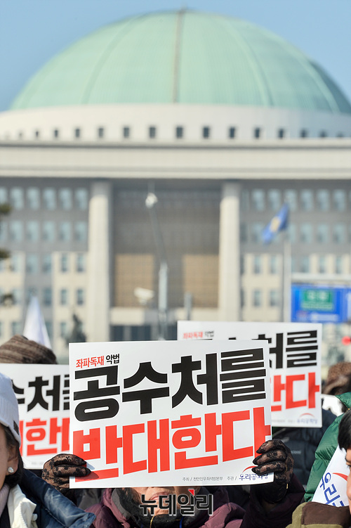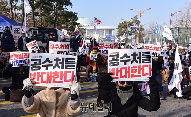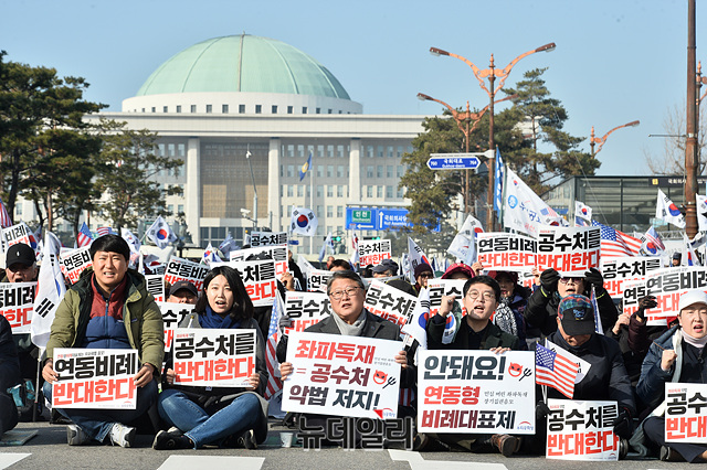 조원진 우리공화당 공동대표와 당원들이 24일 오후 국회 정문 앞에서 열린 '공수처·연동형 비례대표제 반대 집회'에서 손 피켓을 들고 구호를 외치고 있다.