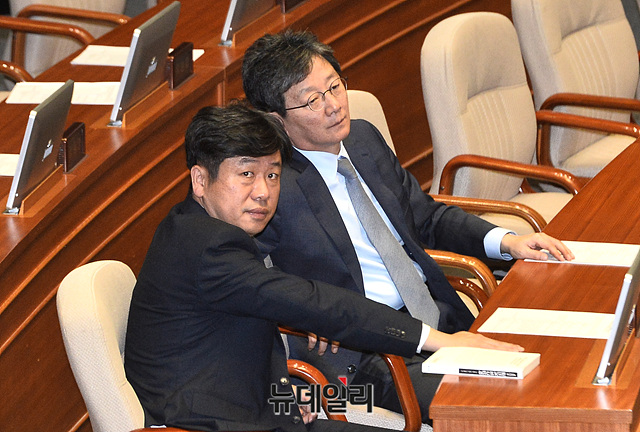 유승민 바른미래당 의원과 유의동 의원이 24일 오후 국회 본회의장에서 열린 제372회 제1차 본회의에 참석해 대화를 나누고 있다.