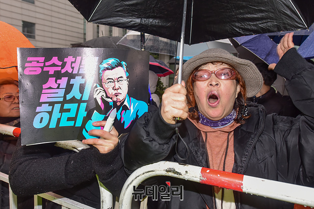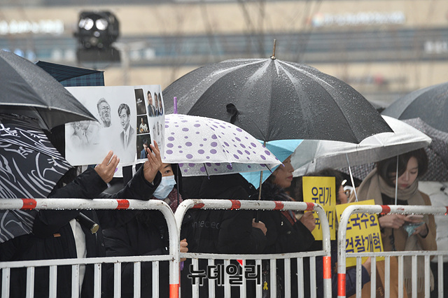 조국 전 법무부 장관 지지자들이 26일 오전 서울 송파구 서울동부지법에서 '조국 수호' 구호를 외치고 있다. 이날 조 전 장관은 유재수 전 부산시 경제부시장에 대한 청와대 감찰을 무마했다는 의혹을 받고 영장실질심사에 출석했다.