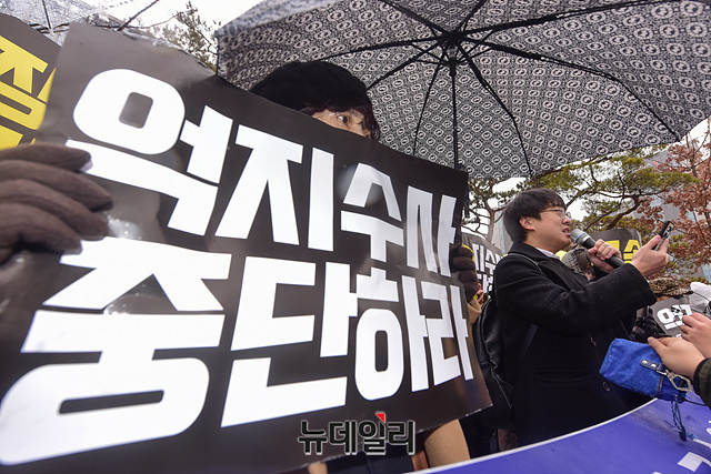 조국 전 법무부 장관을 지지하는 시민들이 26일 오전 서울 송파구 서울동부지법 정문에서 '조국 전 법무부장관 구속영장 기각 촉구 기자회견'을 갖고 있다. 조 전 장관은 유재수 전 부산시 경제부시장에 대한 청와대 감찰을 무마했다는 의혹을 받고 영장실질심사에 출석했다.