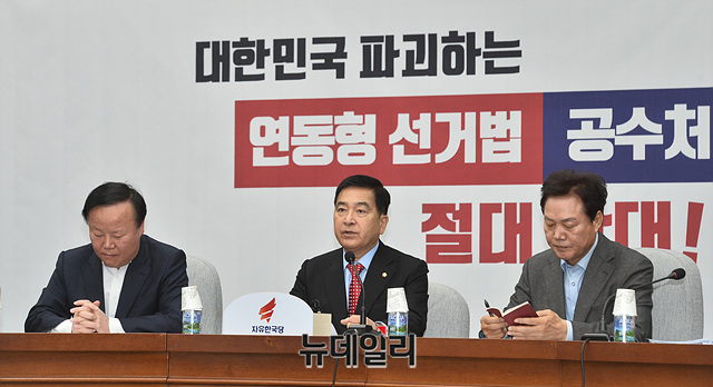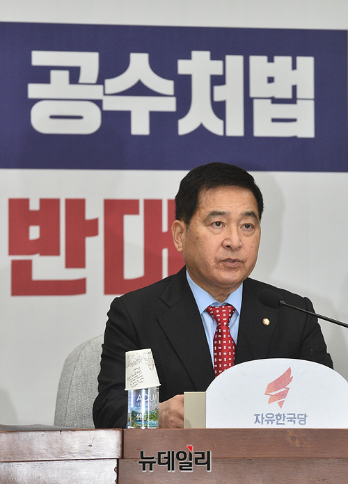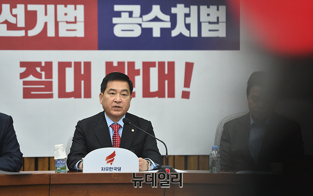 심재철 자유한국당 원내대표가 27일 오전 국회에서 열린 원내대책회의에서 모두발언을 하고 있다. 이날 심 원내대표는 "조국의 직권남용은 우병우의 직무유기보다 무겁고 범죄의 죄질이 안좋다"며 "혐의가 중하다면 구속하는 것이 마땅하다"고 했다.