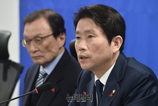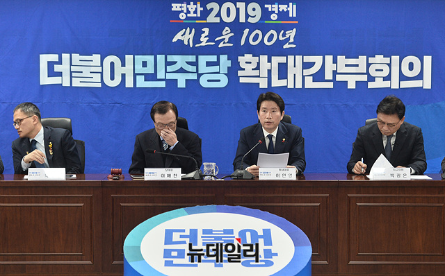 이인영 더불어민주당 원내대표가 27일 오전 국회에서 열린 확대간부회의에서 모두발언을 하고 있다.
